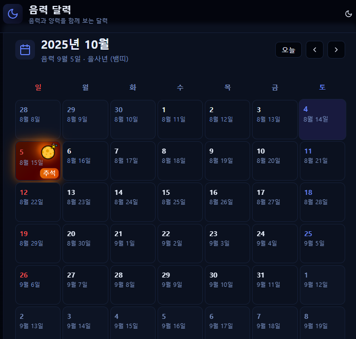 음력 8월 15일 기념일을 등록을 하니 위와 같은 아이콘을 만들고 부각되도록 표시됩니다.